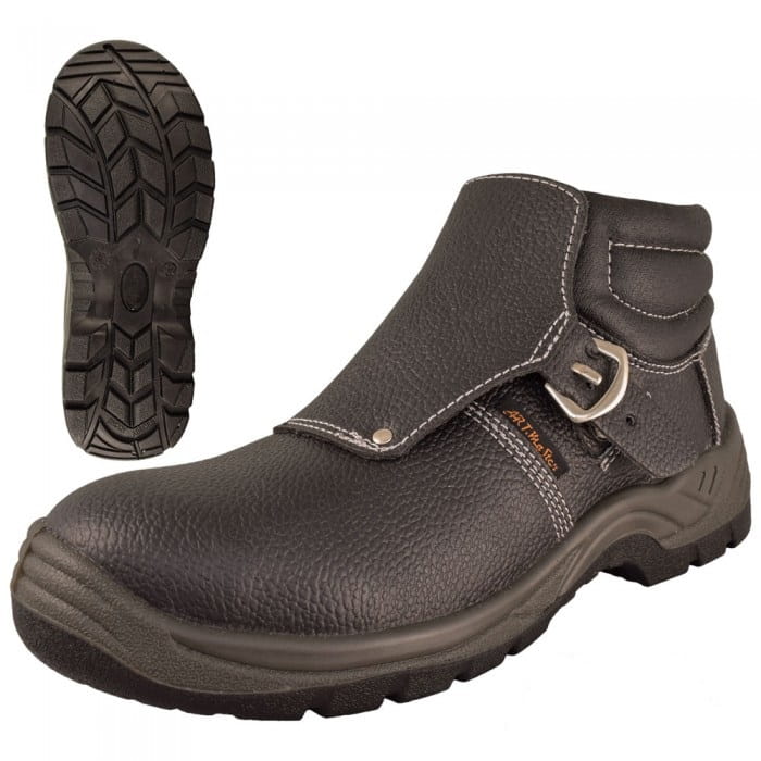 Sicherheitsschuh mit Stahlkappe, Schweißtyp. Die Konstruktion des Obermaterials ist mit einer externen Zunge ausgestattet, um zu verhindern, dass Splitter in das Schuhwerk gelangen. Die sichere Schnalle ermöglicht ein schnelles Lösen des Riemens.
