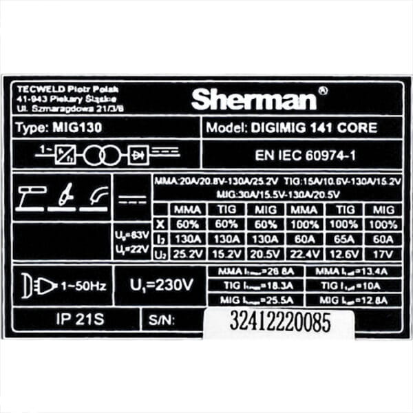 Inverter Schweißgerät 130A – MIG ohne Gas + MMA + WIG Lift – Synergisch, 2T/4T, LED-Display – DIGIMIG 141 CORE – Sherman