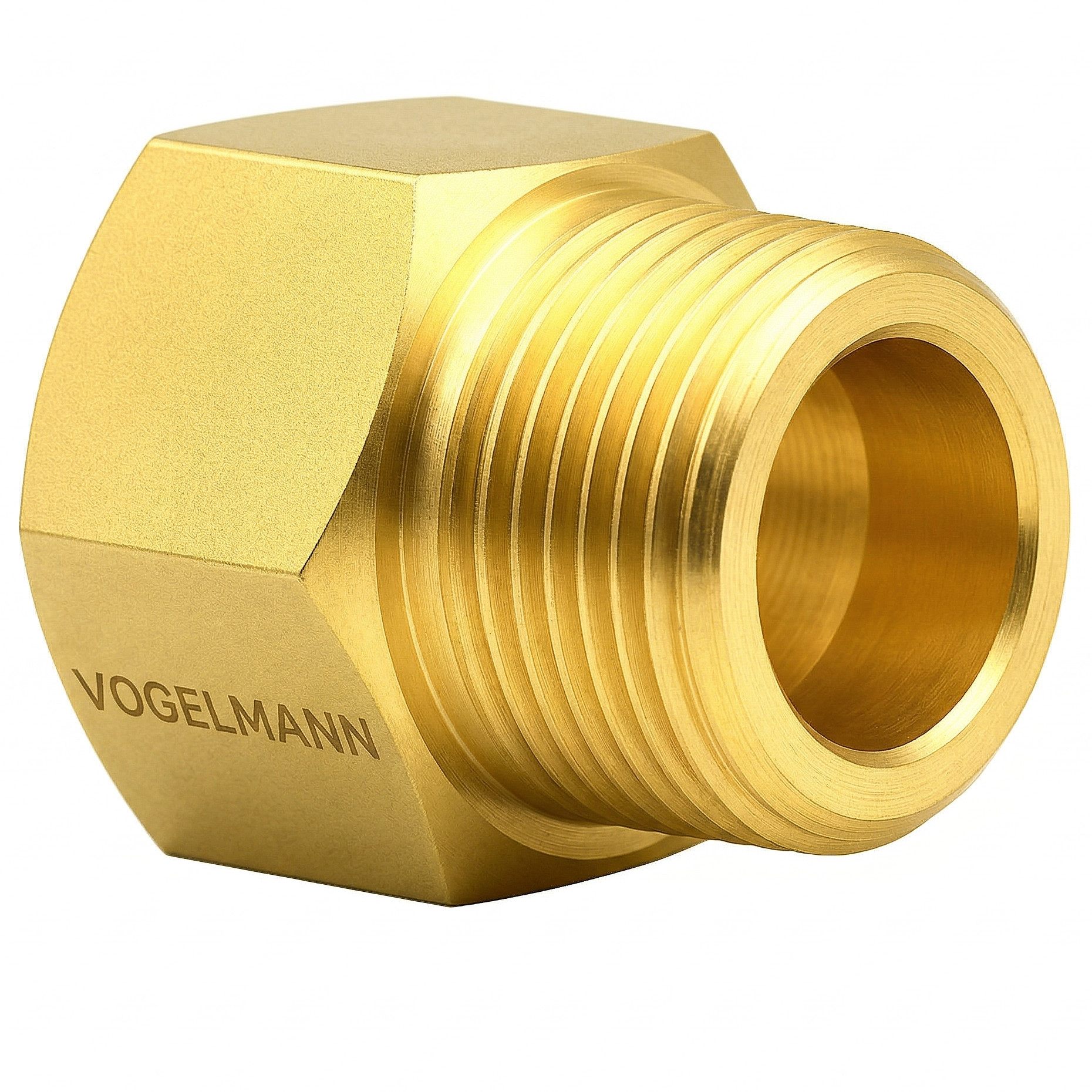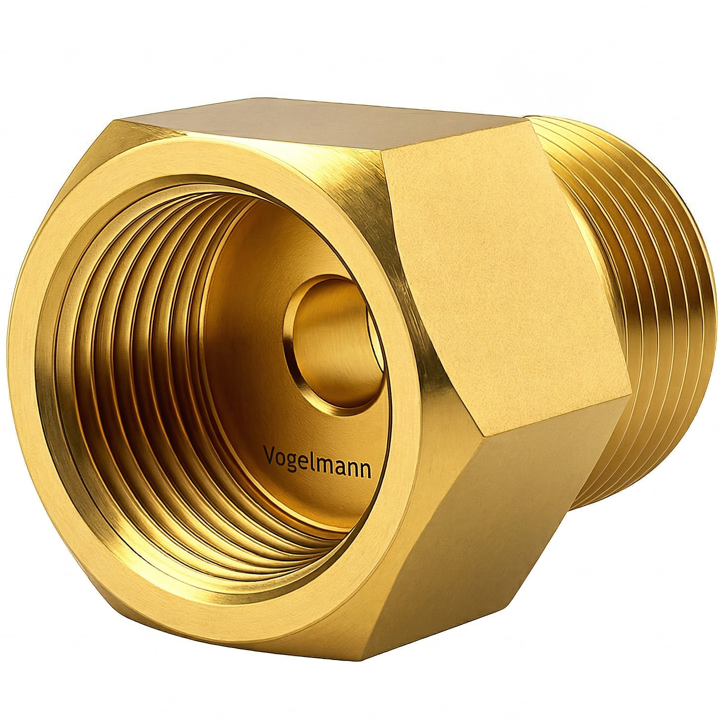 Gas-Reduzierstück der Marke VOGELMANN, gefertigt aus robustem Messing. Ermöglicht den Übergang von einem W21,8x1/14" Innengewinde (DIN 477) zu einem W24,32x1/14" Außengewinde. Wird hauptsächlich verwendet, um eine Schutzgasflasche (Argon, CO₂ oder deren Mischung) mit einem Druckminderer für technische Gase wie Stickstoff zu verbinden.