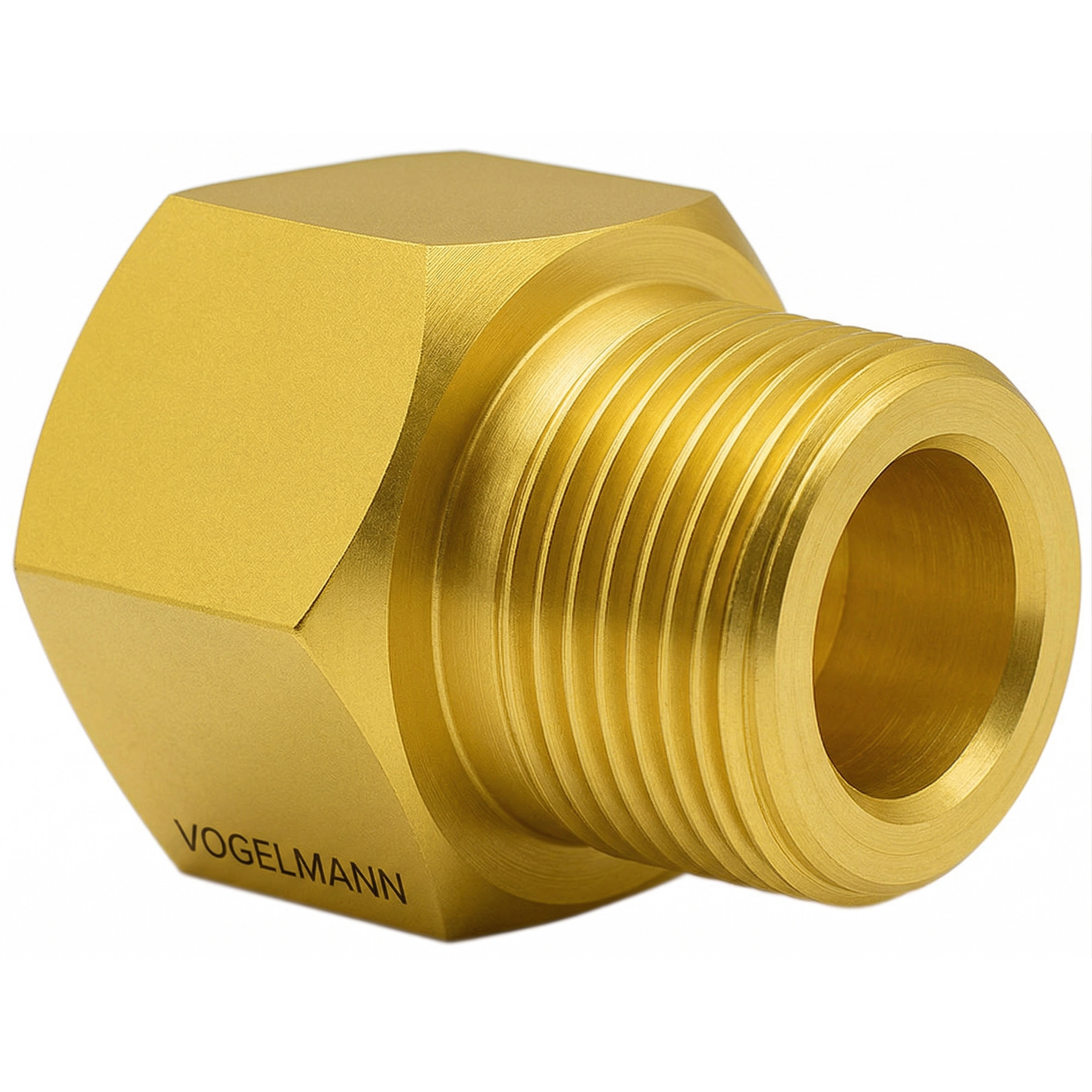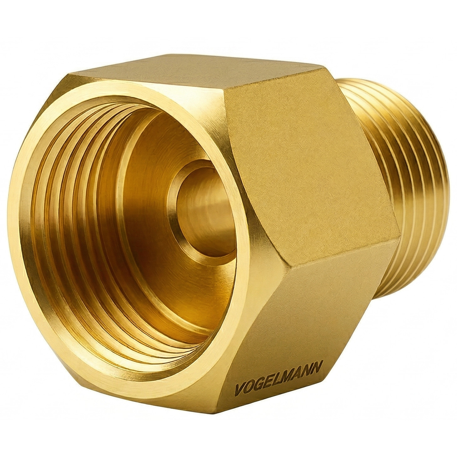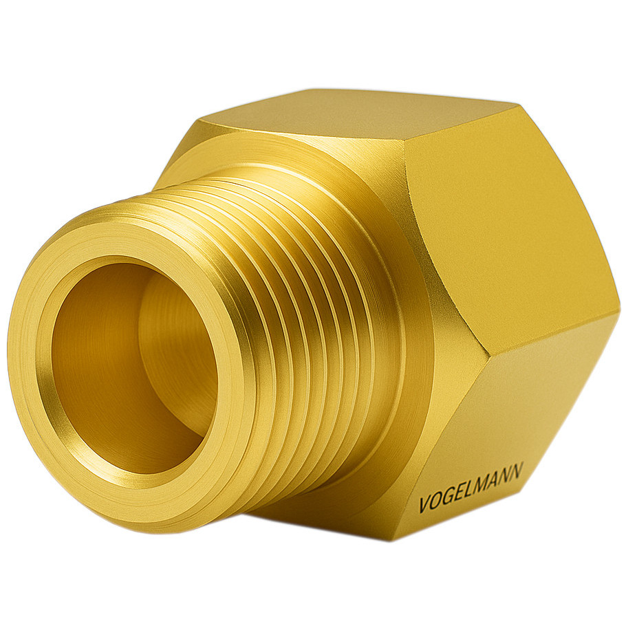 Gas-Reduzierstück der Marke VOGELMANN, gefertigt aus hochwertigem Messing. Ermöglicht den Übergang von einem W24,32x1/14" Innengewinde zu einem W21,8x1/14" Außengewinde. Wird häufig verwendet, um einen Druckminderer für Argon, CO₂ oder Schutzgasmischungen an eine technische Gasflasche, z. B. für Stickstoff, anzuschließen.